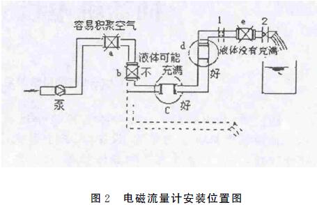 3.2.4對于電*可拆卸的儀表在安裝時(shí)方向錯誤。部分污水流量計(jì)的電*并非安裝在表體測量管壁上,而是與表頭一體并可拆卸,在安裝時(shí)要注意兩個電*的連線應(yīng)與液體流向保持垂直。3.2.5液體未充滿管道,電*之間含有氣體。管道未充滿液體主要是管網(wǎng)工程設(shè)計(jì)或儀表安裝位置不當(dāng),使傳感器測量管內(nèi)不能充滿液體。應(yīng)避免安裝如圖所示a、e的位置和以虛線管排放時(shí)b位置,改裝到c,d位置較好。水平安裝時(shí)應(yīng)使電*的連線保持水平,如果電*一上一下,下部電*會由于介質(zhì)內(nèi)雜質(zhì)沉淀覆蓋電*,上部電*會由于氣泡堆積造成電*與介質(zhì)絕緣。垂直安裝時(shí)應(yīng)裝在流體自下而上流動的管道上,這樣更容易使液體充滿管道。