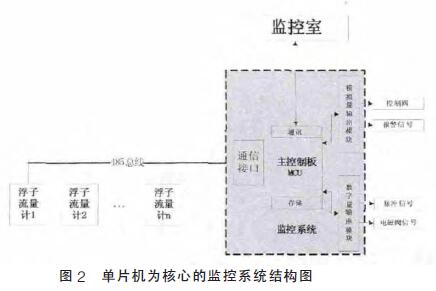 浮子流量計監(jiān)控系統(tǒng)主要功能是模擬量采集輸出, 數(shù)字量采集輸出,由核心模塊進行分析、處理、存儲并和上位機通信。工業(yè)上常用的監(jiān)控系統(tǒng),從組成結(jié)構(gòu)來看主要分為PLC為核心的監(jiān)控系統(tǒng)、現(xiàn)場總線為核心的監(jiān)控系統(tǒng)、單片機為核心的監(jiān)控系統(tǒng)。本設(shè)計主要采用以單片機為核心的監(jiān)控方法,該系統(tǒng)使用廣泛,體積小、功耗低、操作方便、設(shè)計簡便、成本低,是許多小型監(jiān)控系統(tǒng)的*選。單片機為核心的監(jiān)控系統(tǒng)結(jié)構(gòu)如圖2所示。本監(jiān)測系統(tǒng)主要包括現(xiàn)場浮子流量計組、485總線、主控制板MCU 以及模擬數(shù)字輸出控制模塊。