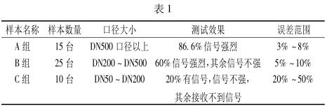 通過大量的在線檢測試驗(yàn),可以看出所測管道管徑對超聲流量計(jì)測試效果有明顯影響。根據(jù)數(shù)據(jù)顯示,管徑越大,測試效果越好,示值誤差越小。隨著管徑的減小,超聲流量計(jì)所能檢測到的流速信號也隨著變?nèi)?,?dāng)口徑小于 DN50 時,基本沒有信號或是產(chǎn)生巨大的干擾信號。