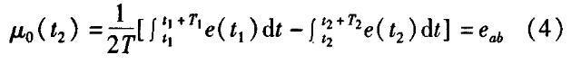 冷卻水流量計一般都采用工頻交流電源供電,其電源電壓的幅值和頻率的變化都會給冷卻水流量計帶來電源性干擾噪聲。對電源電壓的幅值變化,因采用多級集成穩(wěn)壓,一般而言電源電壓的幅值變化對電磁流量的測量精度影響不大。當電源電壓的頻率波動時,雖然其波動范圍有限,但對冷卻水流量計測量精度影響較大。為了解決工頻干擾問題,實現(xiàn)對流體流速感應電勢e柚信號的準確測量,需利用以下基本關系:①勵磁周期為工頻周期的整數(shù)倍,即勵磁頻率為50/nHz(n為偶數(shù));②正負勵磁下的同相位采樣。圖2是對應低頻矩形波勵磁形式下的典型電勢信號形式,按上述關系在一個勵磁周期下,若假設t。和t:點為工頻干擾的等效干擾點,且采樣寬度T=T1=T2,則e –ab的基本算式為:,