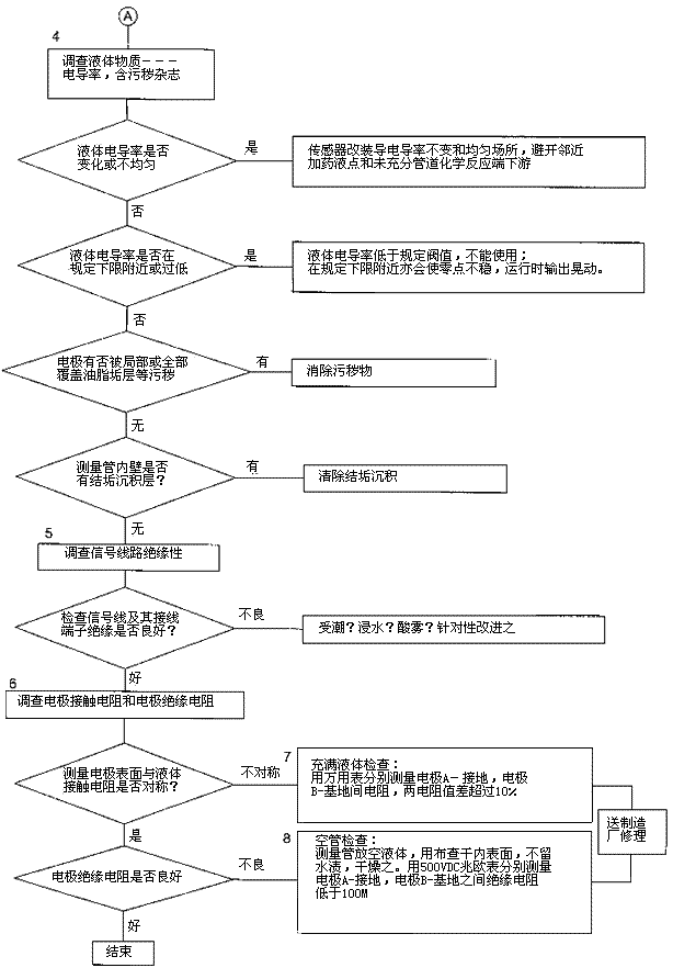 檢查流程圖*5項。信號回路絕緣下降會形成零點不穩(wěn)。信號回路絕緣下降的土要原因足,包*部位絕緣下降所引起的,但也不能排除信號電纜及其接線端子絕緣下降或破壞。因為有時候現(xiàn)場環(huán)境十分嚴酷,稍一疏忽儀表蓋、導(dǎo)線連接處密封不慎,彌漫著潮氣酸霧或粉粒塵埃侵入儀表接線盒或電纜保護層,使絕緣卜降。信號回路絕緣電阻檢查分別按電纜側(cè)和流量傳感器側(cè)兩郵分進行,用兆歐表測試。因信號電纜容易可先做。流量傳感器再分兩次進行:充滿液體測黽電*表面接觸電阻和個管后測量,U*絕緣電阻。