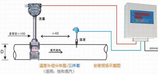 2、溫度補償一體型渦街流量計還帶有溫度傳感器,可以直接測量出飽和蒸汽的溫度并計算出壓力,從而顯示飽和蒸汽的質(zhì)量流量。