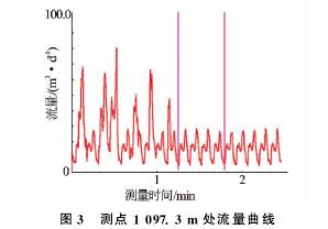 T-××-××1井是大慶油田采油五廠1口水驅(qū)產(chǎn)出井,采用阻抗式含水率計(jì)在該井進(jìn)行了測(cè)試。圖3、圖4分別為測(cè)點(diǎn)深度1097.3m測(cè)量的流量及混相值曲線圖。2min的采樣時(shí)間內(nèi),流量及混相值曲線波動(dòng)劇烈,明顯受井下產(chǎn)氣影響,進(jìn)行平均值計(jì)算時(shí)只能取后半段較平穩(wěn)的數(shù)據(jù),因此,測(cè)試時(shí)需延長測(cè)量時(shí)間。錄取不同范圍數(shù)值時(shí)流量及含水率測(cè)量差值較大,流量平穩(wěn)段為14.81m3/d,高值時(shí)達(dá)到23.52m3/d;取不同測(cè)量段的混相值時(shí)測(cè)量含水率*大相差12%。重復(fù)測(cè)量得到了相同的測(cè)量結(jié)果。由此可見,氣體對(duì)流量及含水率測(cè)量產(chǎn)生了非常大的測(cè)量誤差。