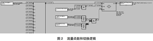但是由于近期趨勢可能收集不到部分負荷段的相關(guān)數(shù)據(jù),在超出現(xiàn)有數(shù)據(jù)負荷的部分應(yīng)采取必要的補救措施,可以參考相同負荷運行的另一臺余熱鍋爐的主蒸汽流量,以此來彌補現(xiàn)有數(shù)據(jù)的不足。為了保證數(shù)據(jù)切換的可靠性,切換條件要嚴(yán)謹,現(xiàn)有函數(shù)的負荷下線上增加25MW與另外一臺的燃機負荷大于100MW。如此設(shè)置的好處是當(dāng)另一臺運行機組突然故障或跳機時保證數(shù)據(jù)能及時切換到函數(shù)輸出,保證機組的安全運行。具體操作見圖2。