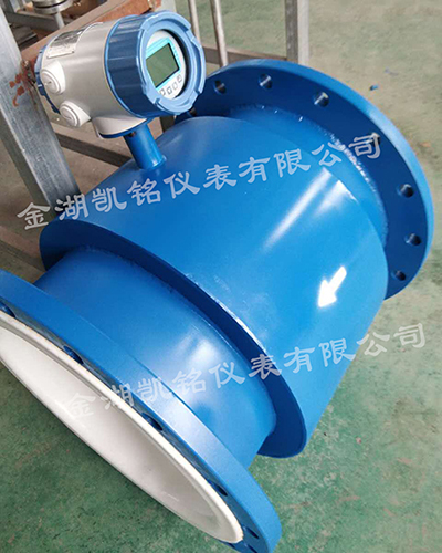 凱銘電磁流量計是以內(nèi)襯絕緣材料做為非導磁合金短管;兩只電*沿管徑方向穿通壁固定在測量管上,其電*頭與襯里內(nèi)表面基本齊平。勵磁線圈由雙向方波脈沖勱磁時,將在與測量管軸線垂直的方向上產(chǎn)生一磁通量密度為B的工作磁場;此時,如果具有一定電導率的液體流經(jīng)測量管,將切割磁力線感應出電動勢E,電動勢E正比于磁通量密度B,測量管內(nèi)徑d與平均流速V 的乘積。電動勢E(流量信號)由電*檢出并通過電纜送至轉(zhuǎn)換器。轉(zhuǎn)換器將流量信號放大處理后,可顯示流體流量,并能輸出脈沖,摸擬電流等信號,用于流量的控制和調(diào)節(jié)。