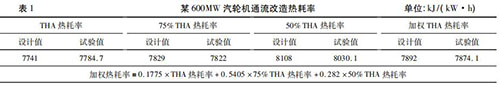 隨著火電機組利用小時數(shù)降低,發(fā)電企業(yè)一般都會根據(jù)不同負荷工況下的實際運行小時數(shù),確定機組熱耗率考核權(quán)重,形成*終的加權(quán)熱耗率考核值。考核加權(quán)熱耗率對設(shè)備廠家末級葉片選型、高壓調(diào)門與高壓缸匹配性提出了更高的要求,在當(dāng)前負荷率偏低的情況下增強了發(fā)電企業(yè)的競爭力。然而,僅僅對加權(quán)熱耗率進行考核是不夠的,設(shè)備廠家為了增強自身的競爭力,往往會把全部重點放在如何降低占比大的低負荷熱耗率上而犧牲高負荷的熱耗率,這無疑削弱了發(fā)電企業(yè)的適應(yīng)性。某廠一臺 600MW 汽輪機通流改造時僅對加權(quán)熱耗率進行考核,THA 熱耗率要高出設(shè)計值43. 7 kJ/( kW·h) ,詳見表 1。通流改造時既要對加權(quán)熱耗率進行考核,也要對 THA工況時熱耗率進行考核。