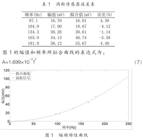 其中 K 1 為儀表系數(shù), D 為管道直徑。在管道口徑 D 不變,流體密度不變的情況下,渦街傳感器的輸出幅值與 f 2 成正比,具體表達(dá)形式可以根據(jù)實(shí)驗(yàn)測出。本文以 50mm 口徑氣體實(shí)驗(yàn)為例,數(shù)據(jù)如表 1 所示:
