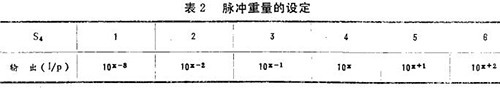 脈沖重量設(shè)定用S4插頭選擇進(jìn)行,它的設(shè)定有一定的條件,這些條件是脈沖輸出的類型、脈沖寬度和刻定常數(shù)。并且它的選擇范圍還要依據(jù)脈沖寬度和*大測(cè)量流量-口-口口-l0的X方(m3/h)來確定。其系數(shù)-(數(shù)字同*大流量m3/h)由*大流量的前三位有效數(shù)定決定,而對(duì)應(yīng)于“x”值的脈沖重量(l/p)見表2。