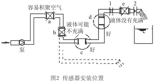 液體流動方向必須與傳感器殼體上箭頭方向一致。對于能正反向測量的智能電磁流量計(jì),若方向不一致雖仍可測量,但設(shè)定的顯示流動正反方向不符,必須改正之。若拆傳感器工作量大,也可改變傳感器上箭頭方向和重新設(shè)定顯示儀表符號。管道未充滿液體主要是管網(wǎng)工程設(shè)計(jì)或傳感器安裝位置不妥,使傳感器測量管內(nèi)不能充滿液體。應(yīng)采取措施,避免安裝如圖2所示a,e位置和以虛線管排放時b位置,改裝到c,d位置。