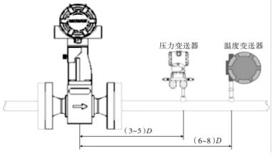 智能渦街流量計(jì)的口徑如果與工藝管道相同,不能滿足流量儀表要求時(shí),或者在此流速下測量準(zhǔn)確度不能保證時(shí),需要縮小儀表口徑,從而提高管內(nèi)流速,保證測量精度。上下游必須有足夠的直管段,若傳感器安裝點(diǎn)的上游在同一平面上有 2 個(gè) 90°彎頭時(shí),上游直管段≥25D,下游直管段≥5D。根據(jù)測量的需要,需在智能渦街流量計(jì)附近測量壓力和溫度時(shí),測壓點(diǎn)應(yīng)在傳感器下游的(3 ~5)D 處,測溫點(diǎn)應(yīng)在傳感器下游的(6 ~8)D 處,如圖 3 所示。