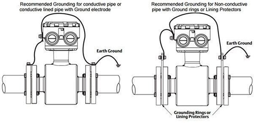 法蘭式流量管:當(dāng)法蘭式流量管安裝在非金屬,塑料,PVC或襯里的工藝管道之間時,SG必須通過除工藝管道法蘭螺栓之外的其他路徑。在這種安裝方案中,需要接地環(huán)或接地電*(圖6)。