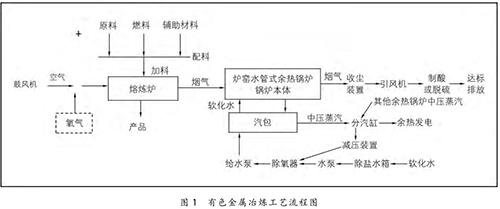在有色金屬冶煉過程中,將原料、燃料和輔助材料根據(jù)熱平衡原理按一定比例進(jìn)行配料,配料后的物料與空氣或高含氧的混合空氣在熔煉爐中進(jìn)行氧化或還原反應(yīng),熔煉出有色金屬產(chǎn)品。同時(shí),在熔煉過程中會(huì)產(chǎn)生大量的高溫?zé)煔猓?1200 ℃ 左右),高溫?zé)煔饨?jīng)過余熱鍋爐時(shí),與余熱鍋爐水側(cè)的軟化水進(jìn)行熱量交換,煙溫迅速降至 250℃ 以下,再經(jīng)收塵、制酸或脫硫裝置進(jìn)一步收塵、降溫、凈化,*終達(dá)標(biāo)排放。余熱鍋爐水側(cè)的軟化水經(jīng)熱量交換后產(chǎn)生中壓飽和蒸汽(4 MPa 左右),送至余熱發(fā)電機(jī)組發(fā)電。具體的工藝流程如圖 1 所示。