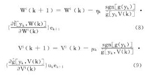 未知, 但其符號已知, 可用sgn[g (yk) ]代替g (yk) , 這樣就可以得到調整W (k) 和V (k) 的學習規(guī)則為
