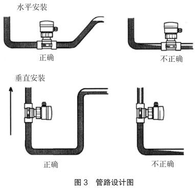 現(xiàn)場安裝時應(yīng)注意遠離可能對其產(chǎn)生干擾的大型設(shè)備,防止長期的熱輻射和其他如磁場直射等環(huán)境影響。為確保高測量精度和較好的零點穩(wěn)定性,進行校正前,智能型電磁流量計應(yīng)裝入工藝介質(zhì)中至少 24 小時電*鈍化。安裝的管路設(shè)計應(yīng)確保管道始終充滿流體,防止測量誤差,管路設(shè)計圖見圖 3。