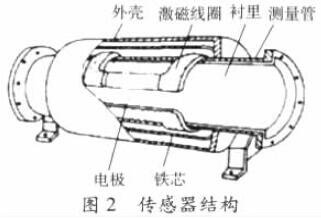 液體流量計(jì)由流量傳感器和轉(zhuǎn)換器兩部分組成。傳感器典型結(jié)構(gòu)示意如圖2,測(cè)量管上下裝有激磁線(xiàn)圈,通激磁電流后產(chǎn)生磁場(chǎng)穿過(guò)測(cè)量管,一對(duì)電*裝在測(cè)量管內(nèi)壁與液體相接觸,引出感應(yīng)電勢(shì),送到轉(zhuǎn)換器。激磁電流則由轉(zhuǎn)換器提供。