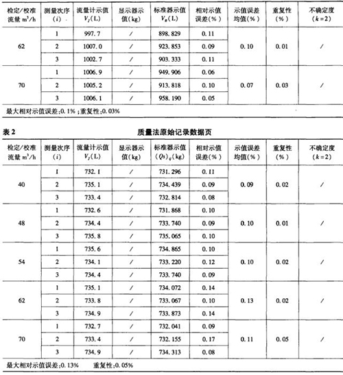 表1是用容積法現(xiàn)場檢測流量計(jì)后,電腦自動(dòng)生成的原始記錄數(shù)據(jù)頁部分,表2是用質(zhì)量法現(xiàn)場檢測流量計(jì)后,電腦自動(dòng)生成的原始記錄數(shù)據(jù)頁部分。