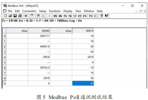 Modbus Poll 通訊測(cè)試結(jié)果如圖 5 所示:Tx = 24140,Err =0,ID = 1,F(xiàn) = 04,SR = 1000ms,Log = on。 其中 ,Tx 為Modbus Poll 發(fā)送命令次數(shù),也就是說在測(cè)試期間 Modbus Poll軟件共發(fā)送讀輸入寄存器命令 24140 次(發(fā)送間隔為 1s,測(cè)試時(shí)間為 6.7 小時(shí));Err 為通訊錯(cuò)誤數(shù),Err = 0 表明 Modbus 通訊模塊正確響應(yīng)次數(shù)為 24140 次(錯(cuò)誤數(shù)為 0)。
