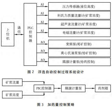 圖3中的礦漿流量與礦漿濃度分別由科氏質量流量計和超聲波流量計測得,并 以4~20mA 電流信號傳送給 PLC控制器。由 PLC控制器根據電流信號值計算出實際的礦漿濃度和礦漿流量值,對上述兩個值進行邏輯處理以及運算,得出實時加藥量。PLC 控制器將計算出的實時加藥量數(shù)據以4~20mA 的電流信號發(fā)送給隔膜計量泵,由其控制并實現(xiàn)加藥量過程的自動控制。