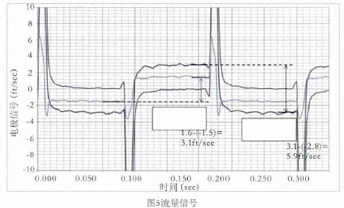 舉例,如圖5所示,線圈采用5Hz驅(qū)動時的0feet/s,3.1feet/s,5.9feet/s流速下的電*信號,利用上述方法對信號進行處理并計算流速。取每半波*后的20%納入流速計算,正半波與負半波相減即是流速。如3.1feet/s–(-2.8feet/s)=5.9feet/s,雖然有+0.15 feet/s的直流偏置,但也不影響流速的計算。因線圈是5Hz驅(qū)動,半波的20%是20ms,正好是1個完整的工頻周期,這樣就不受工頻干擾的影響。正半波與負半波相減,這樣就避免了直流偏置和共模干擾的影響。再加上在數(shù)字濾波過程中使用限幅濾波和算數(shù)平均,保證了流量信號的有效提取。