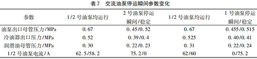 通過內部旁通將冷油與熱油混合,經過銅粉- 煤油 - 蠟感溫元件控制冷熱油混合比例,將油溫調節(jié)到 49 ℃。一臺管道電磁流量計穩(wěn)定運行,油泵出口母管壓力 0. 5 MPa,潤滑油母管壓力 0. 24 MPa,均屬于正常情況,而兩臺交流油泵并列運行時,停運其中一臺交流油泵瞬間會觸發(fā)電磁流量計出口母管壓力開關動作,說明停運瞬間油壓發(fā)生波動,且油泵出口母管油壓波動至小于 0. 45 MPa。正常運行時電磁流量計出口油溫 71.5 ℃,冷油器出口溫度45 ℃,混合后潤滑油母管溫度52.5 ℃,由能量守恒定律可知,經過冷油器的油量/不經冷油器的油量= ( 71.5-52.5) ÷ ( 52.5- 45) = 2. 53,說明有 70% 左右的油量經過冷油器。當 2 臺管道電磁流量計運行時油量大于單泵運行,其中一臺電磁流量計瞬間停運時油量減少,尤其是經過冷油器的油量大量減少,油量在溫控閥二次分配過程中出現(xiàn)調節(jié)異常,導致油壓過大波動。為檢驗溫控閥工作情況,保持 1 號、2 號交流油泵運行,選取機組正常帶負荷運行時油溫 52 ℃,分別停運 1、2 號交流油泵,觀察 1、2 號交流油泵停運瞬間油泵出口母管壓力波動情況,試驗各參數(shù)變化見表 2。