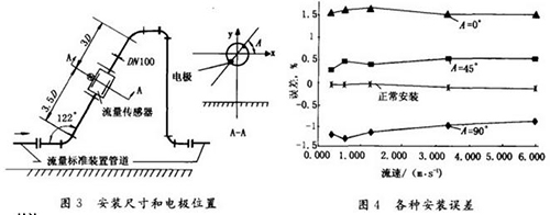 除儀表前直管段可降低彎管影響外,人們還從安裝方式上設(shè)法降低影響的方法。曾報道電磁流量傳感器電*軸線與鄰近彎管平面成45°傾斜安裝可以減少彎管影響。2000年上海原水公司擬在已建成的某泵站加裝DN2200高溫電磁流量計,但彎管下游安裝位置的前直管長度明顯不符合規(guī)定中5D~10D(D為管徑,下同)的要求,此時,影響測量誤差有多大呢?由于受條件限制無法在現(xiàn)場用經(jīng)典的測量方法(如流速計流速面積法)作比對試驗,以估計彎管影響附加誤差值。并且使用方必須在訂購之前就要知道附加誤差估計值,以決定設(shè)計方案。筆者按相似原理以較小口徑高溫電磁流量計在實驗室模擬現(xiàn)場條件作試驗。試驗證明45。安裝可減小彎管影響.并求得該個案安裝條件下傳統(tǒng)安裝方式的影響值。