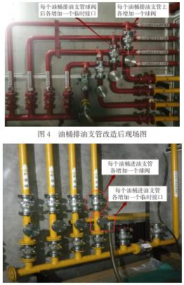 該水電廠在地衣輪機(jī)組檢修結(jié)束后針對(duì)上述弊端,結(jié)合透平油處理室油焦?fàn)t煤氣流量計(jì)布置的現(xiàn)狀,利用無機(jī)組檢修工作的汛期期間,對(duì)油處理室中油處理焦?fàn)t煤氣流量計(jì)進(jìn)行改造。具體改造內(nèi)容為:將各油桶的進(jìn)油和排油支管球閥后增加設(shè)置相關(guān)的臨時(shí)接口,便于油處理設(shè)備通過活接頭和軟管直接與各個(gè)油桶單好連接,可不受機(jī)組透平油供油、回油總管的臨時(shí)連接口限制。在支管上增設(shè)的臨時(shí)接口后各增加一個(gè)球閥,以便于將油桶中的油路切斷而進(jìn)行臨時(shí)接頭和軟管的連接。具體改造焦?fàn)t煤氣流量計(jì)效果見圖4、圖5所示。