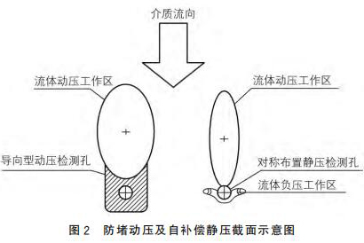 新衛(wèi)生渦輪流量計(jì)采用拋物面導(dǎo)向型結(jié)構(gòu)作為動(dòng)壓測(cè)點(diǎn),采用對(duì)稱自補(bǔ)償型式的靜壓測(cè)點(diǎn),可以有效地解決來流方向偏流時(shí)信號(hào)的穩(wěn)定采集,來流偏離管道軸線時(shí),可以維持輸出差壓基本不變,如圖2所示。