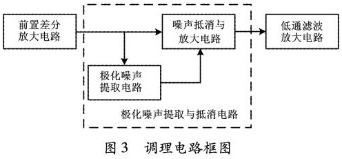 根據(jù)前饋控制的自適應(yīng)*化噪聲抵消原理,設(shè)計(jì)了信號調(diào)理電路2,以實(shí)現(xiàn)*化噪聲的濾除。信號調(diào)理電路2主要包括前置差分放大電路、*化噪聲提取與抵消電路、低通濾波放大電路三部分。調(diào)理電路如圖3所示。