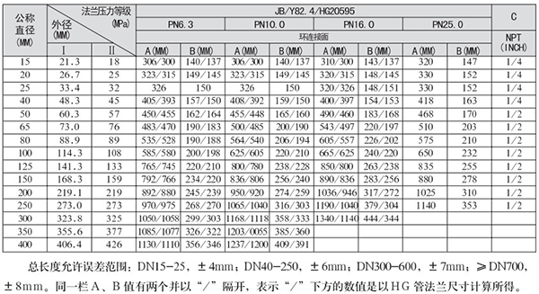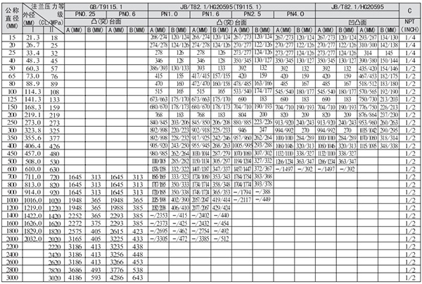 2.尺寸表中同一欄值有兩個(gè)并以/隔開(kāi),表示/下方的數(shù)值是以HG管法蘭尺寸計(jì)算所得。