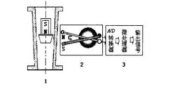 從以上原理分析可知,浮子的高度檢測是通過機電轉(zhuǎn)換單元精確測量懸浮在錐形管中的位置,通常通過磁鋼耦合,帶動機械擺桿轉(zhuǎn)動,使角位移傳感器角度發(fā)生變化,輸出電信號,通過對信號進行處理,進而換算處實際流量。浮子位置隨流量變化頻繁運動,可見該機電轉(zhuǎn)換單元必須非接觸式的,機械磨損小,工作可靠穩(wěn)定,溫度特性好,線性度較高的才能保證輸出的精度。所以傳感器性能的提高意味著金屬管浮子流量計精度的提高。工況條件放寬,使浮子流量計能在更廣泛的工作環(huán)境中得到應(yīng)用。所以本文將對如何提高角度位移測量精度和環(huán)境適應(yīng)性進行研究,如何提高測量的精度?