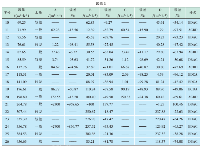 試驗數(shù)據(jù)見表1,其中流量表示污水流量計60min內(nèi)的累計流量;A、B、C、D分別為4個型號的超聲波流量計在60min內(nèi)的累計流量;排名為與同一臺污水流量計比對的4臺超聲波流量計的誤差按從小到大的順序。