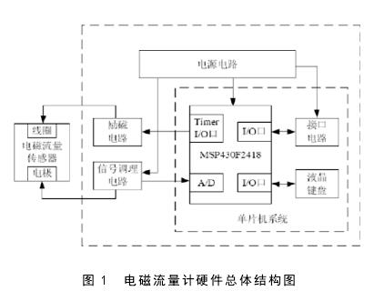 新型固井電磁泥漿流量計的硬件部分是由電源電路、傳感器、信號采集處理電路、勵磁電路以及接口電路共同組成。如圖 1 所示,為電磁流量計硬件總體結(jié)構(gòu)。