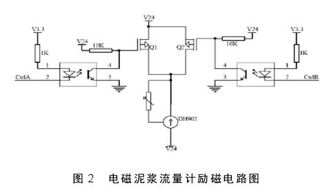 圖中的勵磁電路工作內(nèi)容是控制儀表的工作磁場。其作用原理為 :單片機 MSP430F2418 定時器產(chǎn)生了雙頻矩形波,并經(jīng)光耦隔離后與兩片場效應(yīng)管組成了開關(guān)電路,從而實現(xiàn)了泥漿流量計使用的通斷功能。另一個電路 DH902 是恒流管,其為設(shè)備使用提供恒定的勵磁電流。具體來說,當(dāng) MCU 定時器的脈沖寬度調(diào)制(PWM)輸出后,經(jīng)過濾波就能有效控制勵磁電流的幅值,進而產(chǎn)出雙頻矩形波。如圖 2 所示,為電磁泥漿流量計勵磁電路圖。
