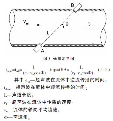 2、超聲流量計以測量超聲波在流動介質(zhì)中傳播的時間與流量的關(guān)系為原理。通常認為超聲波在流體中的實際傳播速度是由介質(zhì)靜止?fàn)顟B(tài)下超聲波的傳播速度cf和流體軸向平均流速vm在超聲波傳播方向上的分量組成。如圖,順流和逆流傳播時間與各量之間的關(guān)系是