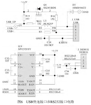 由Q1、R14、R15、R16、L3、D3、R8和R9等元件組成的電路與單片機(jī)對(duì)應(yīng)電路,組成等元件組成的電路與單片機(jī)對(duì)應(yīng)電路,組成USB快速接口電路??焖俳涌陔娐贰C9(SP3232EEY)芯片與周圍元)芯片與周圍元件組成RS232接口電路。電路如圖6所示。