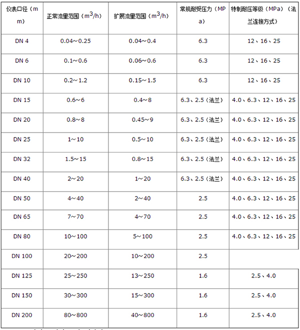 液體渦輪流量計口徑流量對照表