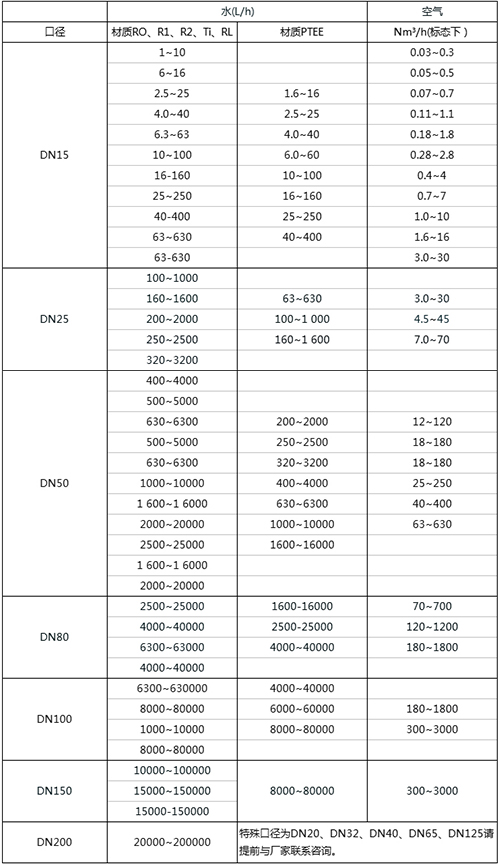 1、測量范圍:水(20℃)2.5-300000 l/h,空氣(20℃,0.1013MPa)0.07-3000m3/h 參見流量表,特殊流量可訂制