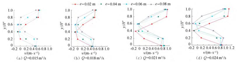 由圖5可知,當(dāng)e相同時,斷面*小流速發(fā)生的位置相同,發(fā)生在浮體結(jié)構(gòu)下游回流區(qū)位置。隨著來流流量的增大,流經(jīng)浮體結(jié)構(gòu)下泄的水流流速在上層和下層水體中呈現(xiàn)增大的趨勢。浮體結(jié)構(gòu)位置不變,由于受到浮體結(jié)構(gòu)的擠壓,上游來流分別經(jīng)過浮體結(jié)構(gòu)上部、下部進行泄流,因此在下游區(qū)域的上層、下層水體中,流速較大;受浮體結(jié)構(gòu)的阻擋,浮體結(jié)構(gòu)下游區(qū)域形成回流區(qū),流速較小。試驗過程中,由于控制浮體結(jié)構(gòu)所在水域的上游、下游水位不發(fā)生變化,因此隨著來流流量的增大,流速呈現(xiàn)增大的趨勢。