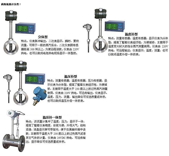 渦街流量計(jì)與現(xiàn)場(chǎng)顯示儀組合后,成為智能一體化流量計(jì),分別用于飽和蒸汽流量計(jì)量、過(guò)熱蒸汽流量計(jì)量、各種化學(xué)氣體流量計(jì)量和各種液體流量計(jì)量。