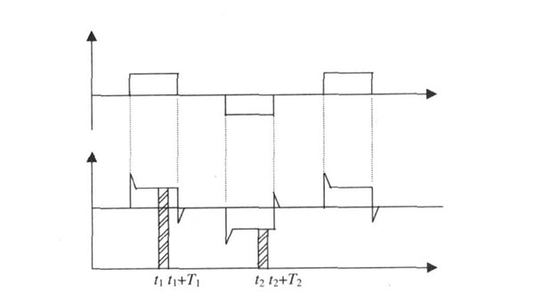 污水管道流量計一般都采用工頻交流電源供電, 其電源電壓的幅值和頻率的變化都會給污水管道流量計帶來電源性干擾噪聲。對電源電壓的幅值變化, 因采用多級集成穩(wěn)壓, 一般而言電源電壓的幅值變化對電磁流量的測量精度影響不大。當(dāng)電源電壓的頻率波動時, 雖然其波動范圍有限, 但對污水管道流量計測量精度影響較大。為了解決工頻干擾問題, 實現(xiàn)對流體流速感應(yīng)電勢eab信號的準(zhǔn)確測量, 需利用以下基本關(guān)系:①勵磁周期為工頻周期的整數(shù)倍, 即勵磁頻率為50/nHz(n為偶數(shù));②正負(fù)勵磁下的同相位采樣。圖2是對應(yīng)低頻矩形波勵磁形式下的典型電勢信號形式, 按上述關(guān)系在一個勵磁周期下, 若假設(shè)t1 和t2 點為工頻干擾的等效干擾點, 且采樣寬度T=T1 =T2 , 則eab的基本算式為: