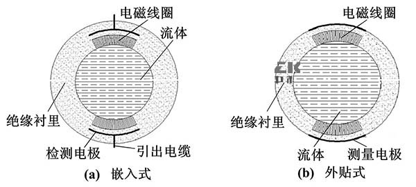 電容式冷卻塔冷卻水流量計從根本上解決了電*表面附著、腐蝕、摩擦等問題,其電*與被測流體間有絕緣襯里隔離,或者直接采用絕緣測量管。電*置于測量管外面或鑲嵌于測量管內(nèi)部。嵌人式冷卻塔冷卻水流量計和外貼式冷卻塔冷卻水流量計的結(jié)構(gòu)如圖2所示。