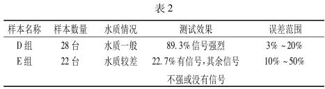 當(dāng)然除了管徑這一大因素外,污水水質(zhì)的好壞也是一個(gè)影響檢測(cè)效果的原因。把受檢的 50 臺(tái)流量計(jì)所流過的水質(zhì)分為兩組,水質(zhì)一般 D 組和水質(zhì)較差 E 組。整理數(shù)據(jù)見表 2。