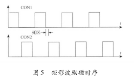 該電路主要由勵磁時序發(fā)生單元、三態(tài)緩沖器及隔離光耦組成。勵磁時序由電磁海水流量計系統(tǒng)的控制核心產(chǎn)生。采用DSP的EPWM外設(shè)模塊,通過設(shè)定其內(nèi)部定時器的工作模式發(fā)出所要求的勵磁頻率的勵磁時序PWM信號CT_1和CT_2。由于勵磁控制系統(tǒng)中的勵磁工作電源的電壓要比DSP的工作電源電壓高得多,為防止勵磁電路故障對系統(tǒng)控制核心產(chǎn)生致命影響,采用光耦將控制部分與勵磁部分進行隔離。另外,由于DSP引腳的驅(qū)動能力有限,所以在DSP與隔離光耦之間加入三態(tài)緩沖器以驅(qū)動隔離光耦的輸入級。并且,DSP能夠通過GPIO口控制三態(tài)緩沖器上的使能引腳來使能和禁止勵磁,以在檢測到電路故障時迅速關(guān)斷H橋所有橋臂。該勵磁時序產(chǎn)生電路通過軟件編程可產(chǎn)生如圖5所示的單頻矩形波。在實際應用中,由于組成H橋的達林頓三*管與MOS管導通與關(guān)斷的時間不一致,易在勵磁方向切換瞬間,產(chǎn)生上下橋臂同時導通的現(xiàn)象,反映在勵磁電流波形上為一幅值很高的窄脈沖。該脈沖電流不僅容易引起遲滯比較電路的誤輸出,從而導致高低壓切換電路與電流旁路電路的誤動作,而且對恒流控制電路產(chǎn)生沖擊,減小三端穩(wěn)壓芯片的使用壽命,同時還會產(chǎn)生EMC電磁干擾,給測量精度帶來影響。所以實際應用時,如圖5所示對方波勵磁時序添加死區(qū),可以明顯減小上述現(xiàn)象。