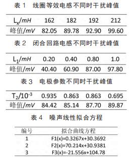 仿真試驗(yàn)中,設(shè)定線圈等效電感取值范圍為 162~212mH,間隔 10mH;閉合回路等效電感范圍 0.2~1mH,間隔為 0.2mH;雙電層電容、接觸電阻隨流體電導(dǎo)率變化而變化,電導(dǎo)率增大接觸電阻和雙電層電容減小而電荷傳遞電阻增大。可設(shè)定電*接觸電阻、雙電層電容和電荷傳遞電阻范圍分別為 5~15kΩ、10~20μF 和50~60Ω,由公式(7)知,可用 T2 表示上述三者關(guān)系。 仿真參數(shù)取值不同情況下,通過(guò) MATLAB 工具箱對(duì)仿真測(cè)量得到的干擾峰值進(jìn)行曲線擬合畫(huà)出相應(yīng)的曲線圖。 其中仿真數(shù)據(jù)和相對(duì)應(yīng)的曲線方程如表 1~表 4 所示,曲線圖如圖 4~圖 6。