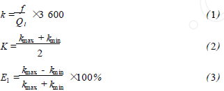 將過熱蒸汽流量計(jì)在標(biāo)準(zhǔn)水裝置上,分別用頻譜分析和脈沖計(jì)數(shù)的方法進(jìn)行標(biāo)定,流體介質(zhì)為水未加氣體,采用的標(biāo)準(zhǔn)傳感器為精度等級(jí)為0.2級(jí)的電磁流量計(jì)。在每個(gè)流量測(cè)量點(diǎn)上的儀表系數(shù)用公式(1)計(jì)算,然后用式(2)計(jì)算得到*終儀表系數(shù)K。Ql為被測(cè)水的流量值,f為每一個(gè)流量點(diǎn)得到的頻率,k為每個(gè)測(cè)量點(diǎn)得到的儀表系數(shù)。kmax、kmin分別為試驗(yàn)流量范圍內(nèi)得到的*大與*小的儀表系數(shù)。儀表系數(shù)的線性度E1用式(3)來計(jì)算。