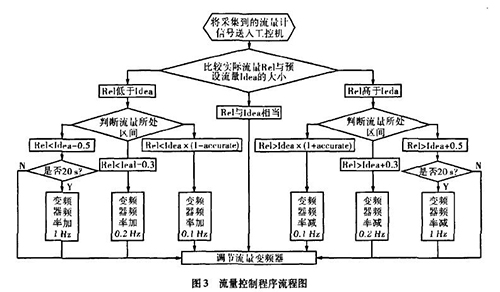 實際生產(chǎn)中流量一直在某個區(qū)域內(nèi)波動,且其動態(tài)特性不易掌握。從上面的理論中我們能夠讓誤差△£盡可能的小,這樣距我們所需要的理論值%就越接近。而減小誤差需要我們把n取的盡可能大,也就是在生產(chǎn)時間內(nèi)劃分更多的周期去調(diào)節(jié)流量。當(dāng)工控機根據(jù)堿性污水流量計傳送回來的信號發(fā)出調(diào)節(jié)變頻器工作頻率的指令后,電機調(diào)整功率到堿性污水流量計的實際測量為一個工作周期,我們知道從指令發(fā)送到實際測量值返回有一個較大的滯后,如果調(diào)節(jié)的周期時間小于流量計本身的一個工作周期,那么顯然不可能達到減小誤差的目的。利用模糊控制思想H。,在控制程序中我們把流量的波動區(qū)域劃分為±缸×Yo,Yo-t-O.3,Yo±0.5四個區(qū)域,其中缸為可調(diào)節(jié)的誤差范圍,生產(chǎn)中我們?nèi)?.015,流量區(qū)域劃分的單位均為t/h。針對不同的區(qū)域采取不同的調(diào)整方案。具體流程如圖3所示。圖中變量Rel表示實際測量的流量,變量Idea表示理論流量。