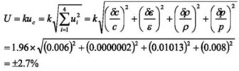 由此可見,當所用差壓計的精度為0.5級,量程為0~600kpa,預設(shè)差壓測景值為300kpa時,對于天然氣孔板流景計,置信概率為95%的測量總不確定度為: