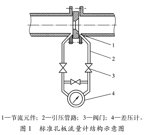 標(biāo)準(zhǔn)管道空氣流量計結(jié)構(gòu)如圖1所示,包括節(jié)流元件(標(biāo)準(zhǔn)孔板及其取壓裝置)、傳輸壓差信號的引壓管路、閥門以及差壓計等部分。標(biāo)準(zhǔn)孔板是壓差測量時的一次元件,人們利用它在管道內(nèi)使流體產(chǎn)生壓差,再通過引壓管路把孔板前、后產(chǎn)生的壓差傳送給差壓變送器,再輸人到二次儀表,從而顯示出管道內(nèi)流體的靜壓、壓差、瞬時流量和累計流量等計量參數(shù)。