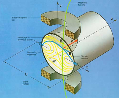 電磁流量計的工作原理是基于法拉*電磁感應定律。在測量管內(nèi)的導電介質(zhì)相當于法拉*試驗中的導電金屬桿,上下兩端的兩個電磁線圈產(chǎn)生恒定磁場。當有導電介質(zhì)流過時,則會產(chǎn)生感應電壓。管道內(nèi)部的兩個電*測量產(chǎn)生的感應電壓。