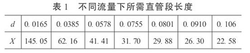 3.直管段長度和成品油流量計精度的初步預(yù)測在工程設(shè)計中,根據(jù)流體性質(zhì)、流量和雷諾數(shù)確定α和d值。這樣,按照式(5)就可以依不同的流量計精度要求,對直管段長度進行初步預(yù)測,或確定直管段長度后,對流量計的精度做初步預(yù)測。當(dāng)δ= 0.2%時,不同流量下所需直管段長度見表1。